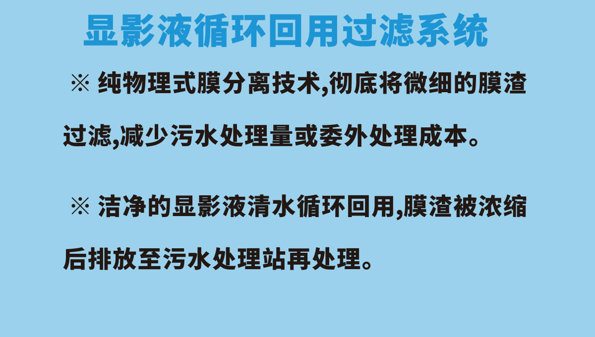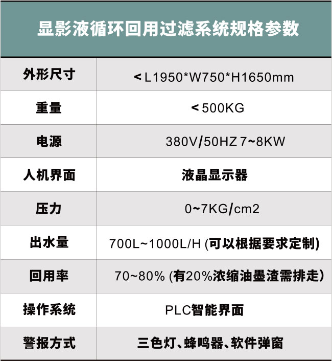 顯影液循環回用過濾系統,打破了傳統的PCB板顯影液的管理方式,不用每天排放,可以循環使用,提高了生產效率,保證了顯影點的穩定性,提升了PCB板的生產品質、可大幅減少廢水廢渣排放,有效利用了水資源,節能環保。