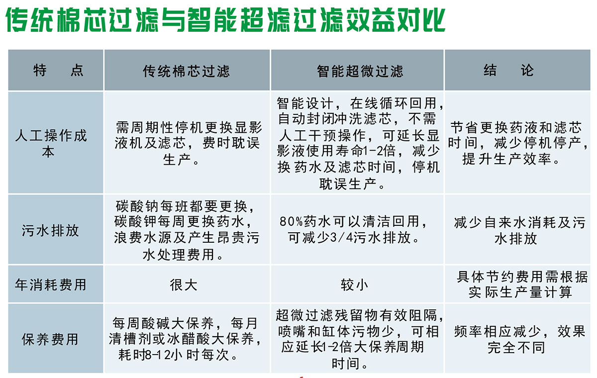 而傳統棉芯過濾系統,已經延用快30年。隨著線路板的高精密飛速發展,及越來越嚴的環保法規,已經很難滿足市場發展需求。使用壽命一般1~2天必須更換,費時費力,換下的費棉芯屬危廢固體,也越來越高的處理成本。