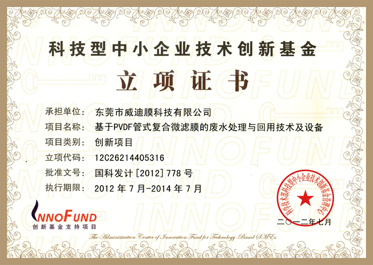 國家創新基金立項證書